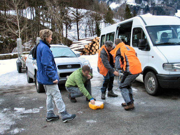 Wir mussten noch ein schönes Stück den Pragelpass hinauf, zum eigentlichen Ausgangspunkt der Tour fahren. Die Passstrasse war stark vereisst und so hiess es Schneeketten montieren. Da dies für einen Unterländer eine nicht alltägliche Arbeit ist, war der Chauffeur um die fachliche Unterstützung froh. |