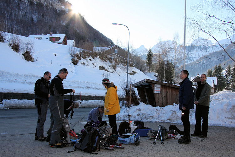 Beim Bushof wurde das Material gesichtet und gleich die Lawinensuchgeräte montiert. Da bereits die ersten Sonnenstrahlen einen warmen Tag ankündigten,