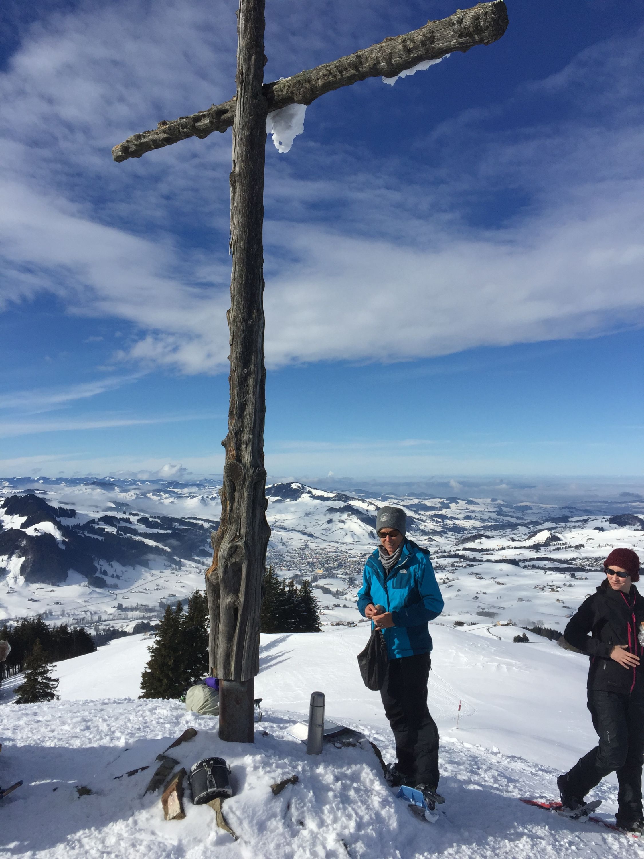 Der letzte Rest von Föhn zauberte imposante Wolkenformationen über den Bergkamm zum Rheintal, der Alpstein zeigte sich in seiner ganzen Winterpracht. In der Sonne konnten wir am Gipfelkreuz des Fähnerenspitz gemütlich Pause machen und das Gipfelbild mit unserem Geburtstagskind schiessen.