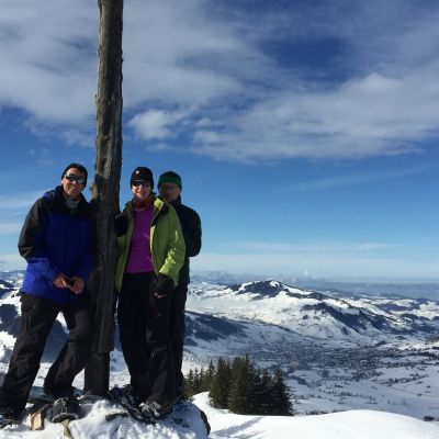 So entschieden wir uns zunächst für eine Kaffeeeinkehr, danach hatten sich die Regentropfen zumindest in Schneeflocken verwandelt, also alles nur noch halb so schlimm. Schnell die Schneeschuhe montiert und schon ging es über die Siedlung Bachers munter bergan. Nach einer Weile hörte der Schneefall auf und man konnte die Sonne hinter den Wolken bereits als hellen Punkt erahnen. Sie setzte sich durch, so dass kurz nach 11 Uhr endlich das ersehnte Wetter eintrat, blauer Himmel und Sonne, der Traum aller Wintersportler