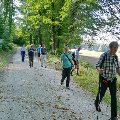 Bei schönem Wanderwetter mit Sonne und ein paar wenigen Wolken ging es zuerst durch das freie Feld in Richtung Schienerberg. Danach folgte ein langer Anstieg im Wald. Wegen dem feuchten Klima im Wald und den warmen Temperaturen haben sich die vielen Mücken hier sehr wohl gefühlt. So haben wir uns nicht nur mit dem steilen Aufstieg, sondern auch mit den lästigen Mücken «abgemüht». Danach folgte eine eher erholsame Wanderung auf der Hochebene.