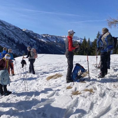 Ausserdem ging es mit den Schneeschuhen anschliessend ordentlich bergauf, sodass wir uns ziemlich schnell aller warmer Kleidung einschliesslich Handschuhen entledigten. Erst mal ging der Weg durch lichten Wald mit mal mehr mal weniger Schnee, dann Richtung Skipiste zu einem Sessellift. Nach dem strengen Anstieg wanderten mehrere sehnsüchtige Blicke-auch meine-Richtung Sessellift. Ein freundliches „weiter geht’s“ hat uns aus dem Träumen gerissen und die letzten Höhenmeter an der Piste entlang zum höchsten Punkt angetrieben. Dort oben hat uns eine grandiose Aussicht auf die umliegenden, leider NICHT dick verschneiten, Bergketten für die 660 hm belohnt.